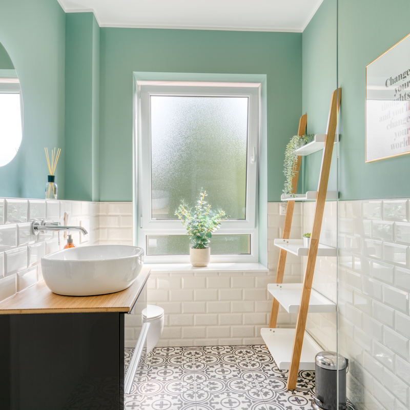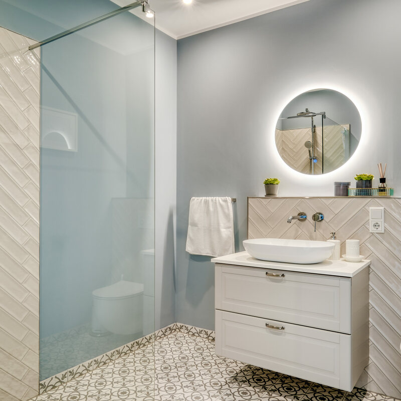 - Bad mit flacher, großzügiger Duschwanne oder bodentiefer Dusche mit einer Regenduschbrause: Genießen Sie eine erfrischende Dusche in einem modernen Badezimmer.