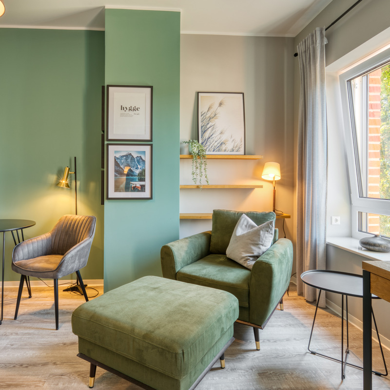 - Tisch mit Stuhl oder Bartisch mit Barstühlen: Ein gemütlicher Ort zum Essen, Arbeiten oder Entspannen.